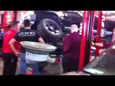 More user error than lift error, the mechanic probably misjudged the width of the vehicle so it got stuck between the two lifts when they lowered it down. They had to manually jack it by hand from below to lift the truck up and free the truck from it. May not look like a big deal but this can probably damage the suspension arm and make the car unbalanced which is very dangerous. The mechanics joked around after the truck was freed. We hope no real damage was done.